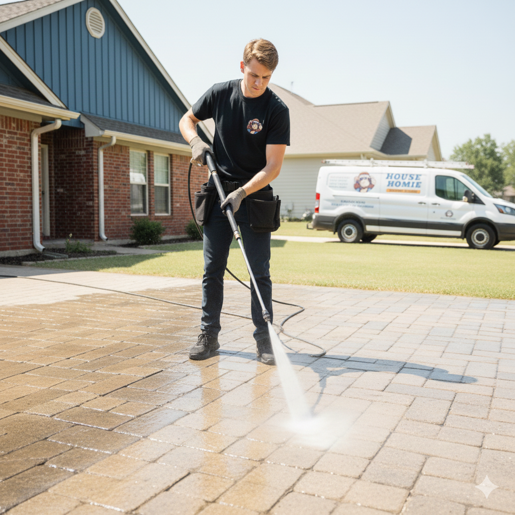 We deep clean interlock and re-sand the joints to remove buildup, stabilize the pavers, and restore a clean, finished look.